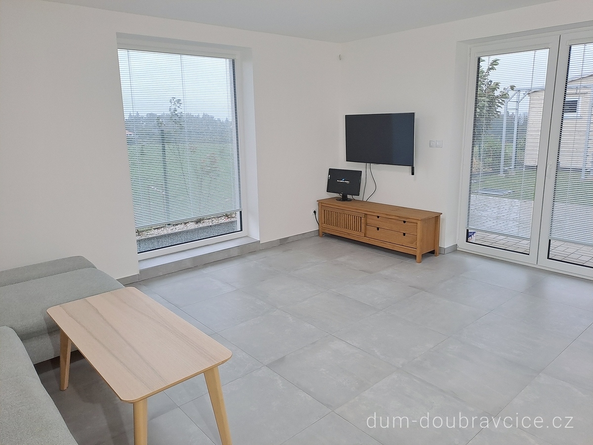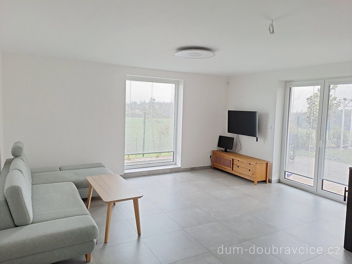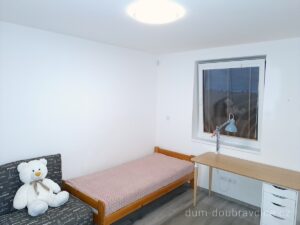 Obývací pokoj s kuchyňským koutem, tři samostatné neprůchozí ložnice, kde je vstup z centrální chodby domu, koupelna s WC technická místnost s WC, chodba, předsíň.